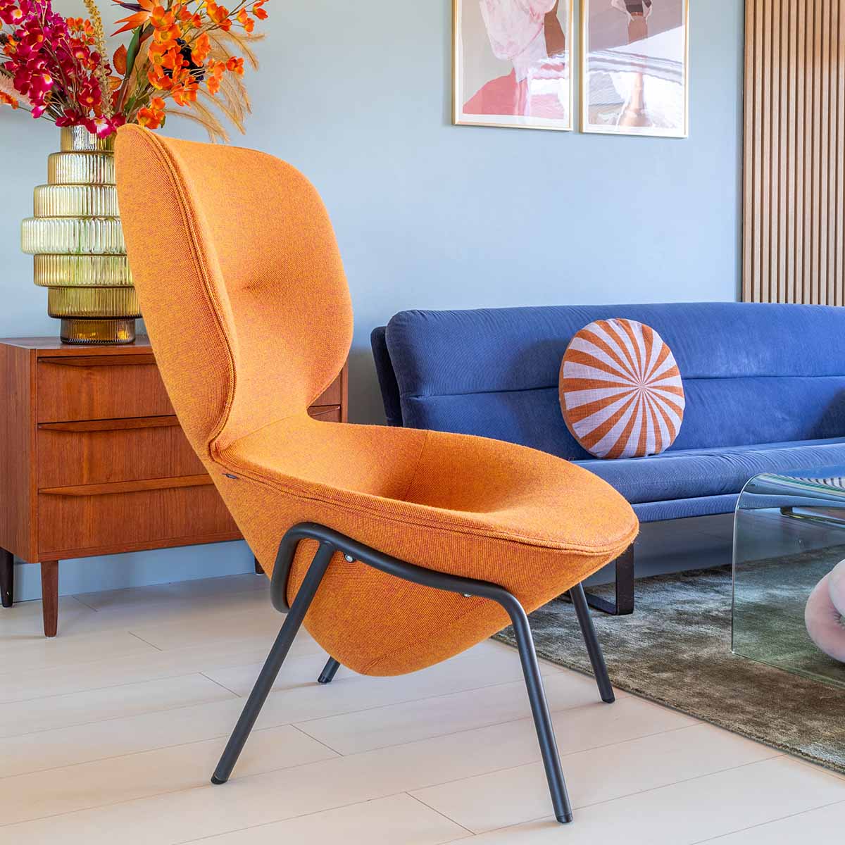 De Orange Slice is verkrijgbaar met twee zithoogtes: 41 cm voor een comfortabele, ontspannen zit of 44 cm voor wie liever iets actiever zit. Daarnaast heb je keuze uit een groot aanbod van stoffen en leer en kan de fauteuil gecombineerd worden met de bijpassende Orange Slice poef.