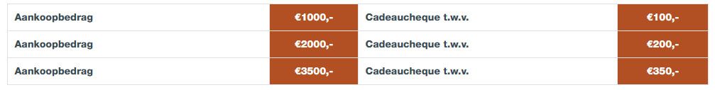 Ontvang bij een besteding vanaf € 1000,- een INHOUSE cadeaucheque ter waarde van 10% van je aankoopbedrag. Deze cadeaucheque is uitsluitend in te leveren in één van onze winkels. En hoe hoger je aankoopbedrag, hoe hoger de waarde van jouw shoptegoed.