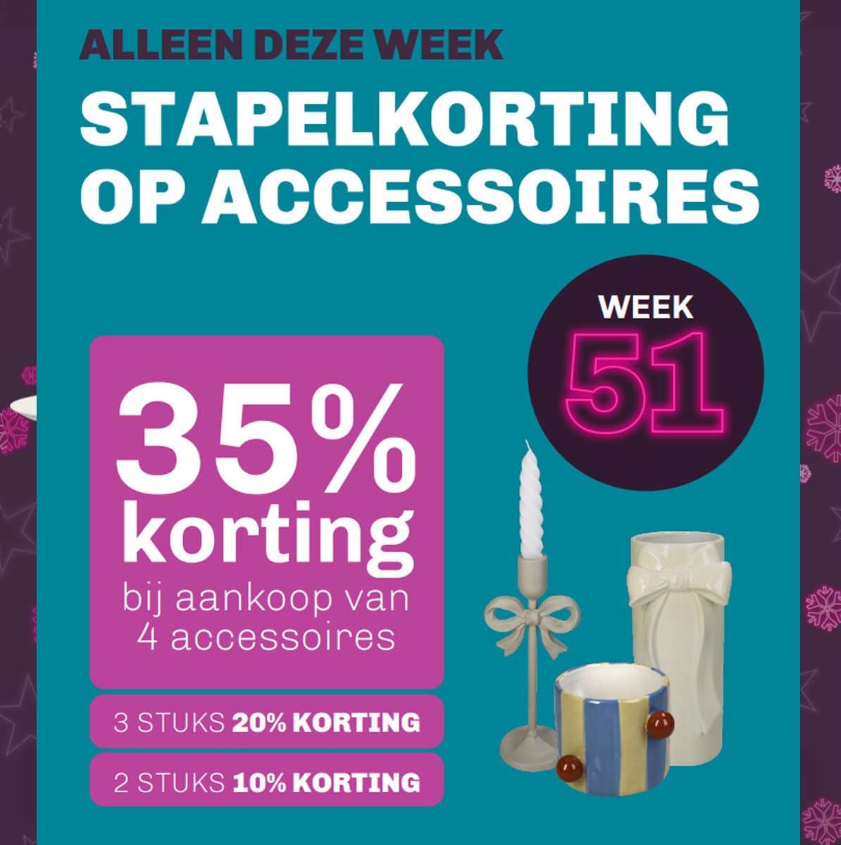 Deze week krijg je 35% korting bij aankoop van 4 accessoires, 20% korting bij aankoop van 3 accessoires en 10% korting bij aankoop van 2 stuks accessoires.