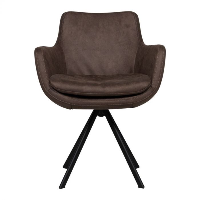 Armstoel Danny bestaat uit een bruine bull microleder zit en zwart metalen poten. Het is een armstoel met draai mechanisme, waardoor je eenvoudig van en naar de tafel toe kan draaien. Danny is leverbaar in diverse leder- en stof soorten en heeft tevens ook diverse pootmogelijkheden.