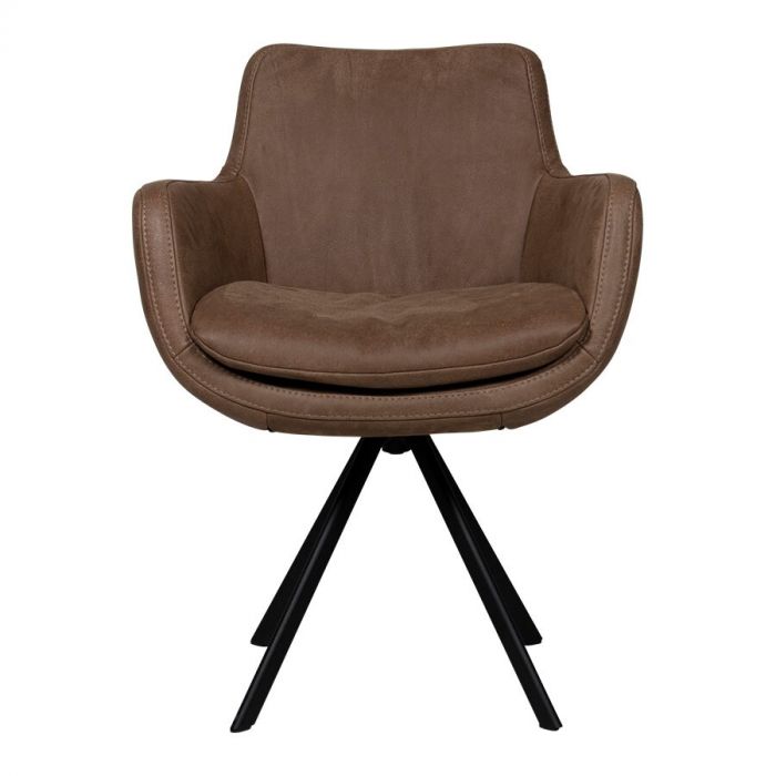 Armstoel Danny bestaat uit een bruine Kenia lederen zit en zwart metalen poten. Het is een armstoel met draai mechanisme, waardoor je eenvoudig van en naar de tafel toe kan draaien. Danny is leverbaar in diverse leder- en stof soorten en heeft tevens ook diverse pootmogelijkheden.