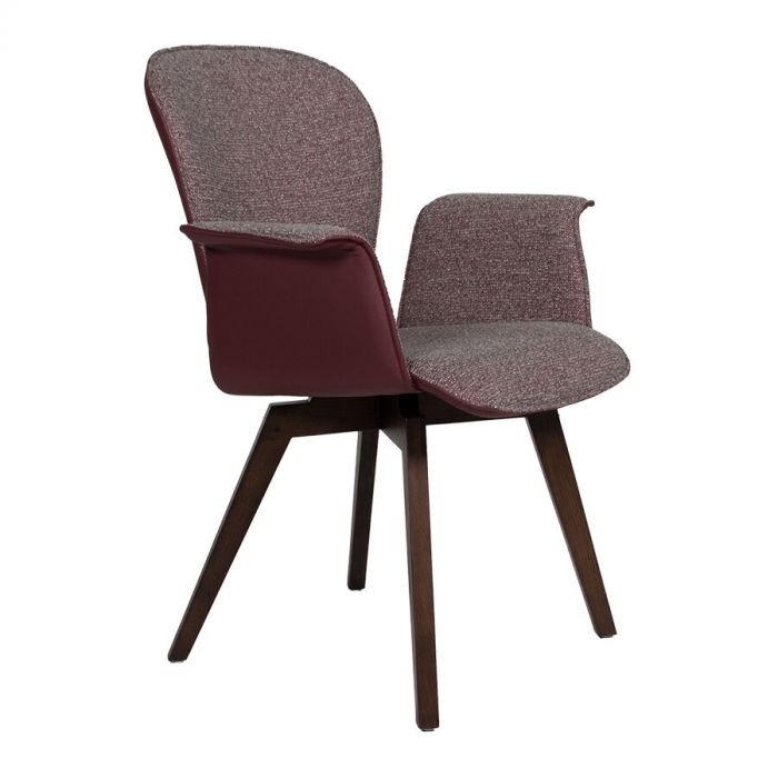 Blake Wood is voorzien van een eikenhouten vierpoot onder de ranke kuip. De gesloten gestoffeerde armen geven een open effect doordat de bovenkant in een vloeiende lijn naar buiten staan. Blake staat voor comfort en design dus is het heerlijk en mooi tafelen in één setting. De getoonde uitvoering heeft een duo stoffering in de stof Sneak Scarlet aan de binnenkant en leder Elba Rubino aan de buitenkant van de kuip. Het frame is gelakt in Noten blonde lak en sluit mooi aan in het ontwerp. Dit model in onderdeel van een stoelenconcept waar meerdere uitvoeringen, zoals poten, zonder armen en stofferingen mogelijk zijn. Leder, stof in diverse kleuren en types geven je de optie je eigen stoel samen te stellen. Alle frames hebben ook nog eens een mooi lakkleurenpalet waardoor je de juiste match kunt maken.
