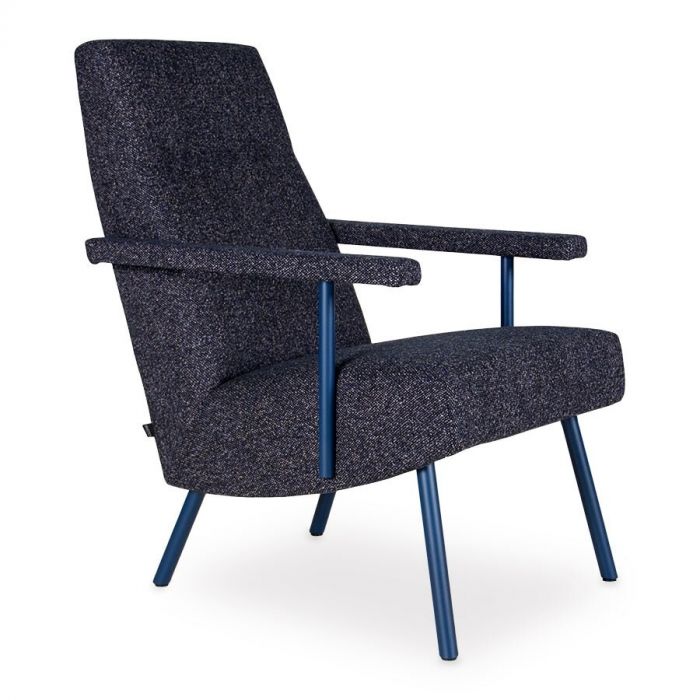 De fauteuil Mr. Cliff, kenmerkt zich door strakke, vaste zit- en rugkussens die mooi contrasteren met het slanke, ronde onderstel. Dit biedt een comfortabele zitervaring. De fauteuil kan naar eigen voorkeur worden samengesteld, waarbij de keuze bestaat tussen leer of stof in verschillende kleuren. Bovendien is er de mogelijkheid om te kiezen tussen een lage of hoge rugleuning. Het metalen onderstel wordt standaard geleverd in RAL 9005 epoxy (structuurepoxy FTX), maar tegen een meerprijs is het ook mogelijk om te kiezen voor andere RAL lakkleuren. De gestoffeerde armleuningen zorgen voor extra comfort. De getoonde hoge uitvoering van de fauteuil is bekleed in de blauwe gemeleerde weefstof Vanir-0693, gecombineerd met een opvallende kobaltkleurige onderstel in de afwerking Epoxy-RAL 5003.