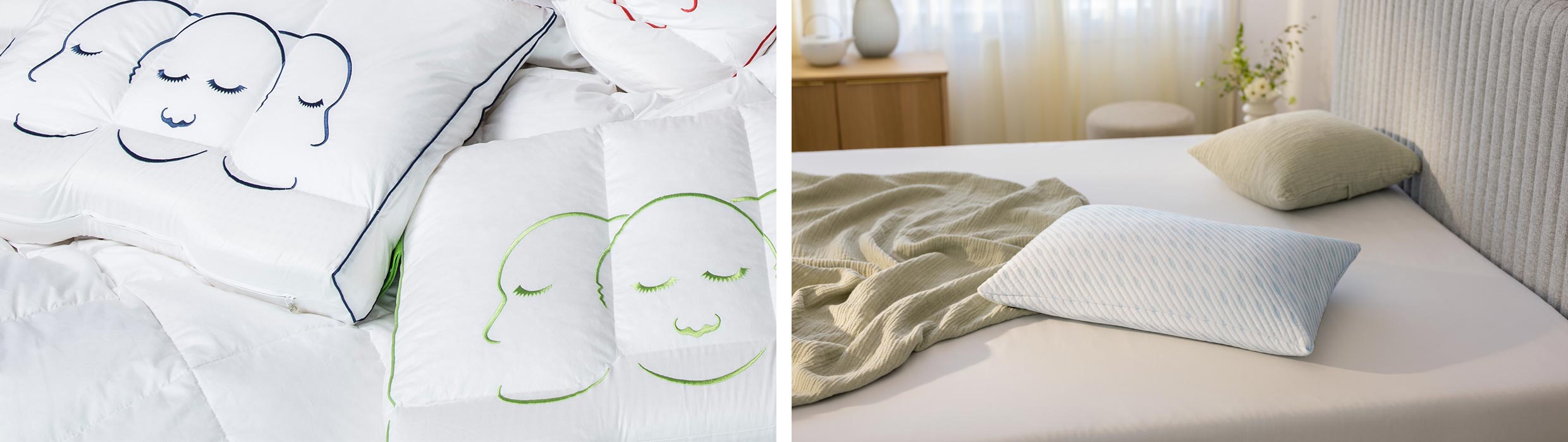- Hoofdkussen voor zijslapers: zijslapers hebben een kussen nodig dat wat hoger ligt. Daarnaast is het belangrijk dat je met je schouder tegen het kussen aan ligt en níét op het kussen. Hiermee zorg je ervoor dat de holle ruimte onder je nek goed wordt opgevangen in de zijligging.