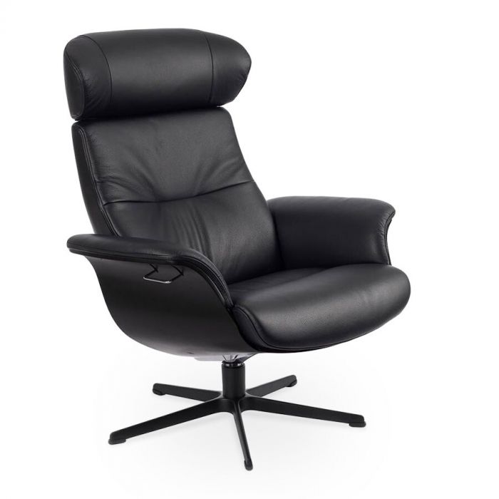 Getoonde uitvoering: het showroommodel is de variant met de hoge rug. De stoel is bekleedt met leder in de kleur Fantasy-2514/89 Black en de zijkanten zijn van eiken fineer in een bijpassende zwarte kleur. De stoel staat op een stevige zwart metalen potenset met 5-tenen, gemaakt van aluminium.