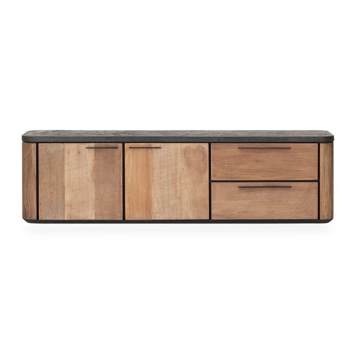 De getoonde uitvoering is hangend waardoor er een ruimtelijke en moderne sfeer ontstaat. Het karakter van het gerecycled teakhout zorgt voor een warme en landelijke uitstraling. De subtiele nerven en natuurlijke patronen vertellen het verhaal van het hout, waardoor elk exemplaar uniek is. Het blad is afgwerkt met Mortex, welke een bijzonder contrast geeft met het hout. Mortex is een decoratieve pleister op basis van cement en kalk. De metalen handgrepen geven het meubel een industriële uitstraling. De opvallend afgeronde hoeken voegen niet alleen een speels element toe, maar maken het meubelstuk ook veilig en kindvriendelijk. Met twee deuren en twee laden biedt dit ontwerp voldoende opbergruimte voor al je media-apparatuur, accessoires en andere benodigdheden. Het Soho tv-meubel maakt deel uit van een uitgebreide serie die jou de mogelijkheid biedt om een samenhangende en stijlvolle inrichting te creëren.