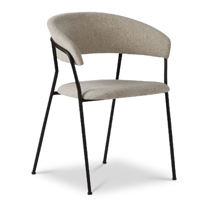 De stoel heeft ronde rugleuning die naadloos overloopt in de armen. Het ranke metalen frame geeft de stoel een moderne en stijlvolle look. Deze combinatie van materialen en vormgeving maakt de stoel zowel comfortabel als visueel aantrekkelijk. Het is een perfecte keuze voor een stijlvolle eetkamer of een moderne interieurinrichting. Jon is bekleed met een zachte chenille stof Baran in de kleur Shell. De overige verkrijgbare kleuren zijn antracite, cognac en natural. Je hebt daarbij keuze uit een zwart frame of wit frame.