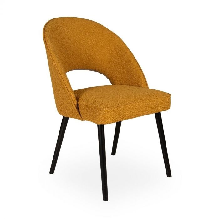 De stoel is bekleed met een warm gele Bouclé stof genaamd Copenhagen 400, die zorgt voor een vrolijke en uitnodigende sfeer in je interieur. De bouclé stof voelt zacht aan en heeft een licht wollige textuur, waardoor de stoel niet alleen comfortabel is om op te zitten, maar ook een extra dimensie van textuur en stijl toevoegt. De houten poten vormen een mooi contrast met de zachte stof. Het natuurlijke hout voegt warmte en een vleugje natuurlijke schoonheid toe. De ronde rugleuning biedt een comfortabele en ergonomische zitervaring. Een leuk detail is de uitsparing aan de onderkant van de rug, dit geeft de stoel een speels en eigentijds tintje, waardoor het design extra opvalt. Janice is leverbaar in de stoffen Juke, Adore, Copenhagen en Feel Me uit de Awesom collectie. De pootkleur is standaard zwart.