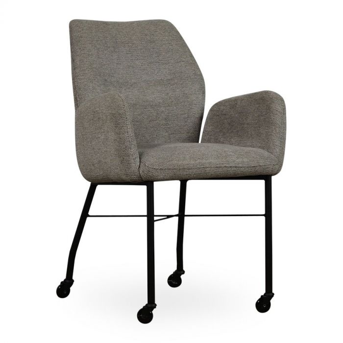Wendy is bekleed met de stof Mito 40. Deze aangename stof heeft een rijke textuur en diepe kleur en zorgt voor een subtiele elegantie. De zwarte metalen poten, slank maar stevig, dragen bij aan de moderne uitstraling van de stoel. De toevoeging van skatewielen is een slimme touch die niet alleen praktisch is, maar geeft ook een speels effect. Deze wielen zorgen ervoor dat de stoel gemakkelijk te verplaatsen is, zonder in te leveren op stabiliteit of stijl. Dit model is leverbaar in diverse stoffen, waardoor hij moeiteloos kan worden aangepast aan uiteenlopende interieurstijlen en persoonlijke voorkeuren.