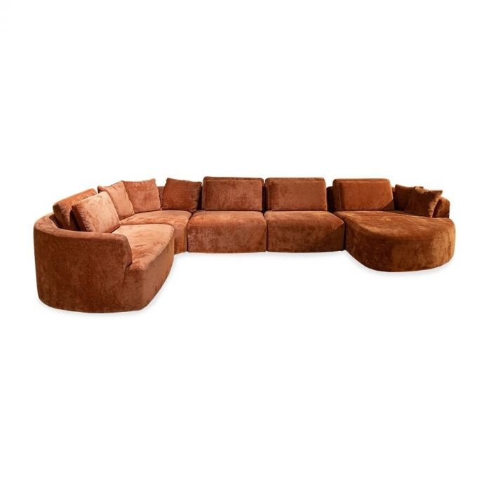 De rondom afgestoffeerde elementen geven je meer vrijheid bij het indelen van je interieur en biedt mogelijkheden voor creatieve opstellingen. De vormgeving is rond en organisch, wat een gevoel van zachtheid en gezelligheid creëert. De bekleding is gemaakt van een prachtige velvetstof Harmony in een betoverende Copper kleur. De velvetstof voelt heerlijk zacht aan en geeft de bank een luxueuze uitstraling. De getoonde uitvoering bestaat uit de elementen 1,5-Zits XL arm links / 1,5-Zits zonder armen / Hoekelement rond en Divan rond arm rechts. Naast deze opties zijn er meerdere varianten om je eigen opstelling te maken. Er is een ruime stoffencollectie beschikbaar zodat je de bank volledig naar eigen wens samen kunt stellen. Zelfs meerdere stoffen en kleuren toepassen in éen creatie behoort tot de mogelijkheden.