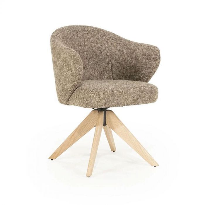 Het draaibare onderstel van naturel eikenhout voegt een luchtig, modern accent toe en maakt de stoel ideaal voor gebruik aan de eettafel. De combinatie van de subtiele textuur van de bekleding en het lichte hout zorgt ervoor dat de stoel moeiteloos past in zowel moderne als landelijke woonstijlen.