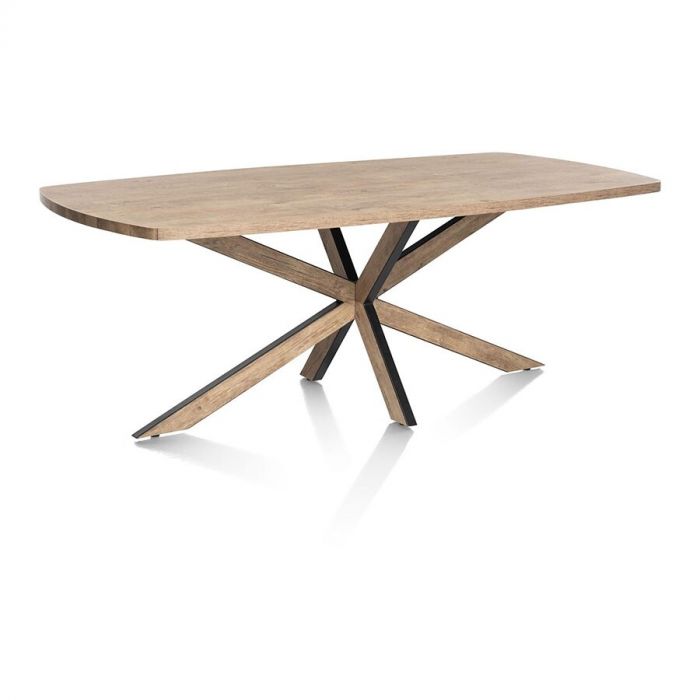 De ovale vorm van de tafel biedt meer flexibiliteit dan een rechthoekige tafel, omdat het geen scherpe hoeken heeft die de bewegingsvrijheid van de gasten beperken. Bovendien kunnen meer mensen aan een ovale tafel zitten dan aan een ronde tafel met dezelfde diameter. De kruispoot in het midden van de tafel biedt niet alleen een stabiele ondersteuning voor het tafelblad, maar creëert ook een centraal punt waar gasten zich kunnen verzamelen en gemakkelijk kunnen communiceren met elkaar. Dit bevordert een gevoel van verbondenheid en gezelligheid tijdens het dineren. De metalen details geven het meubel een stoere en industriële look, waardoor het een echte eyecatcher in jouw interieur zal zijn. Het materiaal van deze collectie ziet eruit als hout, maar is veel onderhoudsvriendelijker dan echt hout. Een vochtige doek is voldoende om je meubels lang mooi te houden. De zwarte metalen details contrasteren met de lichtere houttint. De woonserie Pantin bestaat uit verschillende meubelstukken die qua stijl, materiaal en afwerking goed bij elkaar passen. Hierdoor creëer je eenheid in je interieur en ziet het er consistent en harmonieus uit.