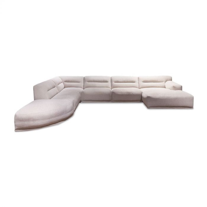 Het massieve ontwerp van de hoekbank geeft een gevoel van stevigheid en geborgenheid. De halfronde hocker voegt niet alleen extra functionaliteit toe maar is tevens een speels en uniek element. De gestoffeerde smalle plint zorgt voor een verfijnde afwerking en een naadloze overgang tussen de bank en de vloer. Met de trekstrook in de rugkussens wordt een subtiel gecapitonneerd effect gecreëerd. Arvenis is leverbaar in diverse leder- en stofsoorten, en biedt een scala aan kleuropties om aan verschillende smaken en interieurvoorkeuren te voldoen. Met de diversiteit aan elementen die beschikbaar zijn, kun je de gewenste opstelling samenstellen en de zitbank aanpassen aan jouw specifieke wensen en behoeften. De getoonde uitvoering bestaat uit de elementen: Hocker halfrond - 1,5-Zits zonder armen - Hoekelement - 1,5-Zits zonder armen - 1,5-Zits zonder armen en een Longchair arm rechts. De stoffering Silent in de kleur Cream brengt een gevoel van lichtheid en frisheid in de ruimte.