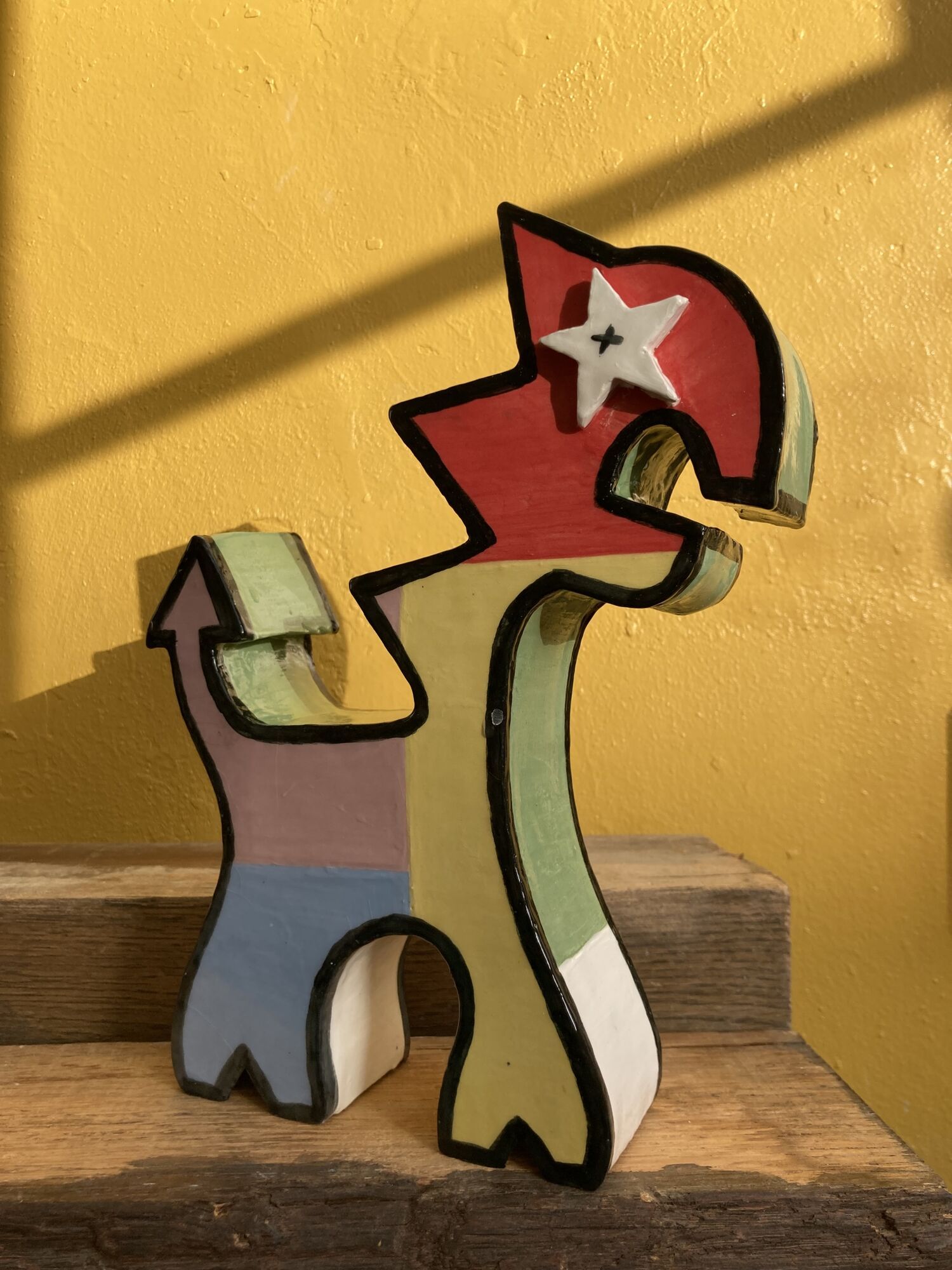 Om het strakke karakter van de Beestjes te behouden, werk ik met engobes. De zachte, poederige kleuren vormen een bewust contrast met de scherpe lijnen en duidelijke contouren. Platen klei zijn daarbij altijd mijn vertrekpunt. Klei laat zich sturen, maar biedt ook weerstand en precies die wisselwerking maakt het spannend. Tussen controle en loslaten krijgt het werk zijn vorm.