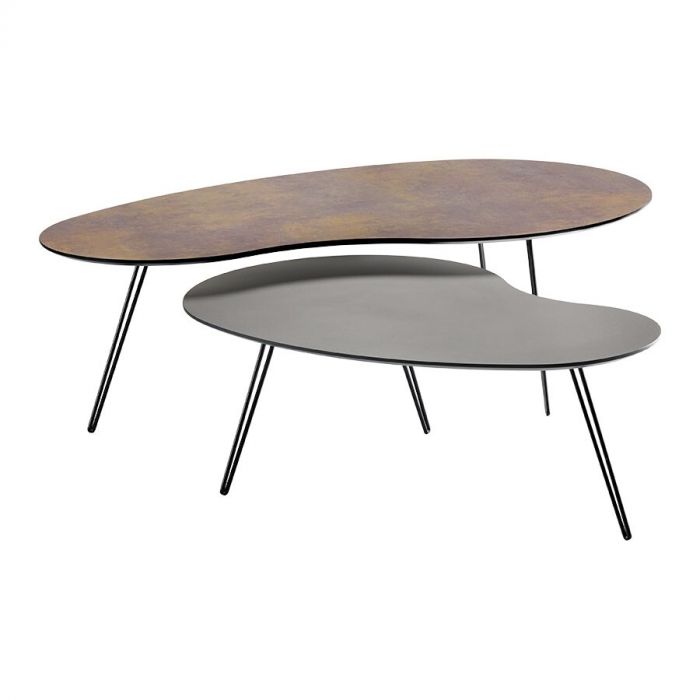 Zoek je een salontafel set die totaal anders is dan wat je tot nu toe zag? Dan is Yania van INHOUSE jouw tafel! De bladen hebben een speelse organische niervorm en in combinatie met de spitse metalen mat zwarte poten is dit dé eyecatcher in je kamer. De set bestaat uit twee salontafels die prachtig met elkaar combineren. Het blad is 13 mm dik en van kunststof HPL en standaard voorzien van een zogenaamde verjongde zwarte bladrand. Dit wil zeggen dat de bladrand naar binnen toe is afgeschuind. Dit geeft de tafels een mooi rank silhouet. De spitse zwart mat metalen poten kunnen op iedere gewenst plek gemonteerd worden.