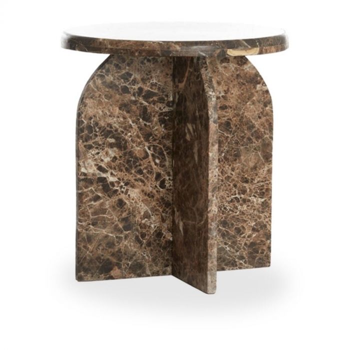 De tafel is niet alleen functioneel, maar ook een kunstwerk op zich, met een poot die eveneens is vervaardigd uit hetzelfde marmer als het tafelblad. Marmer heeft intrigerende aders en patronen, die ontstaan door de natuurlijke vorming van het gesteente. Deze kenmerken maken elk stuk marmer uniek en dragen bij aan de esthetische aantrekkingskracht. Voor degenen die een lichtere tint in hun interieur verkiezen, is de Otinia bijzettafel ook verkrijgbaar in travertin zand. Zowel de donkerbruine als travertin uitvoering is leverbaar in twee verschillende hoogtes: 48 en 56 cm, met een diameter van 41 cm.