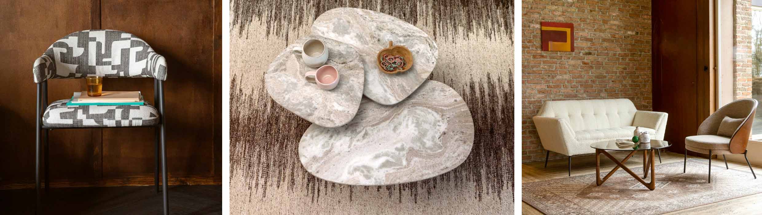 Het gevoel van thuiskomen en de behoefte aan een plek om te cocoonen komen perfect tot uiting in de collectie van Dutchbone. Hun designs kenmerken zich door zachte ronde vormen en afgeronde hoeken, gecombineerd met pure en robuuste materialen in diepe, warme kleuren. Van hout in diverse kleurschakeringen en staal met een antieke finish tot glas in verfijnde toepassingen – elk ontwerp ademt karakter. Ook rijke bekledingen zoals velvet, suède en fijngeweven stoffen spelen een belangrijke rol in de collectie.