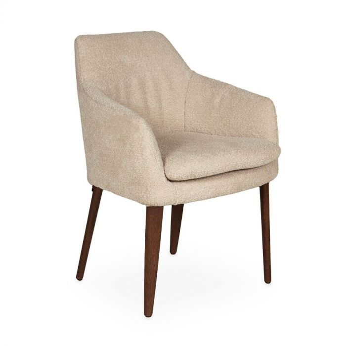 Zowel het zitvlak als de onderkant van de rugleuning zijn opgevuld en bekleed met zachte plooien. Hierdoor wordt de rug royaal bedekt. Dit zorgt voor maximale ontspanning en aangenaam zitten tijdens urenlang tafelen. Gehuld in een verleidelijke boucléstof in zacht beige, straalt deze stoel een serene warmte uit. De eikenhouten ( E42 ) poten voegen een vleugje natuurlijke charme toe aan het geheel. De getoonde versie met armen is tevens zonder verkrijgbaar. Saga is volledig personaliseerbaar en kan met stof, leder of kunstleder worden bekleed. Het onderstel is beschikbaar in beuk, eik of notelaar.