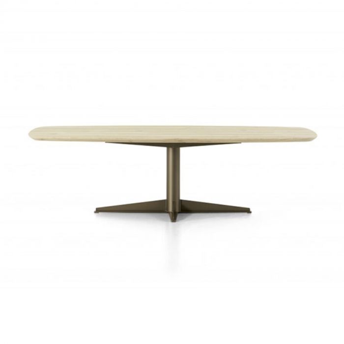 Het eikenhout, bekend om zijn duurzaamheid en fijne nerf, geeft de tafel een warme, uitnodigende uitstraling. De lichte kleur van het hout vangt natuurlijk licht op een manier die de ruimte groter en lichter doet lijken. Contrasterend met het zachte, natuurlijke hout is de ondersteuning van de tafel een stoere, bruin metalen poot. Deze poot, met een robuuste en industriële uitstraling, zorgt voor een interessante visuele balans.