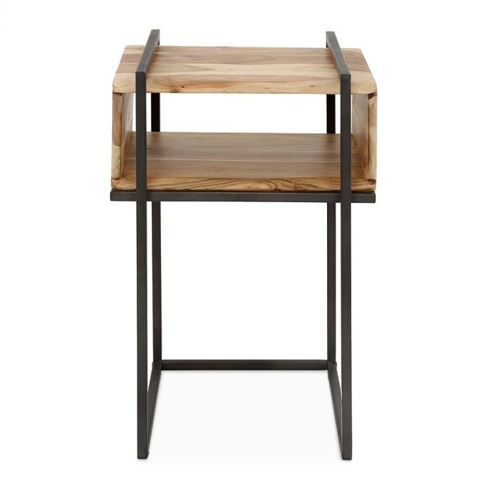 Edge is vervaardigd uit warm acaciahout en omlijst door een verfijnd metalen frame. Het ontwerp wordt gekenmerkt door een enkel open vak, met aan elke zijde een kenmerkende live edge afwerking. Dit subtiele detail voegt een natuurlijk accent toe aan het strakke ontwerp.