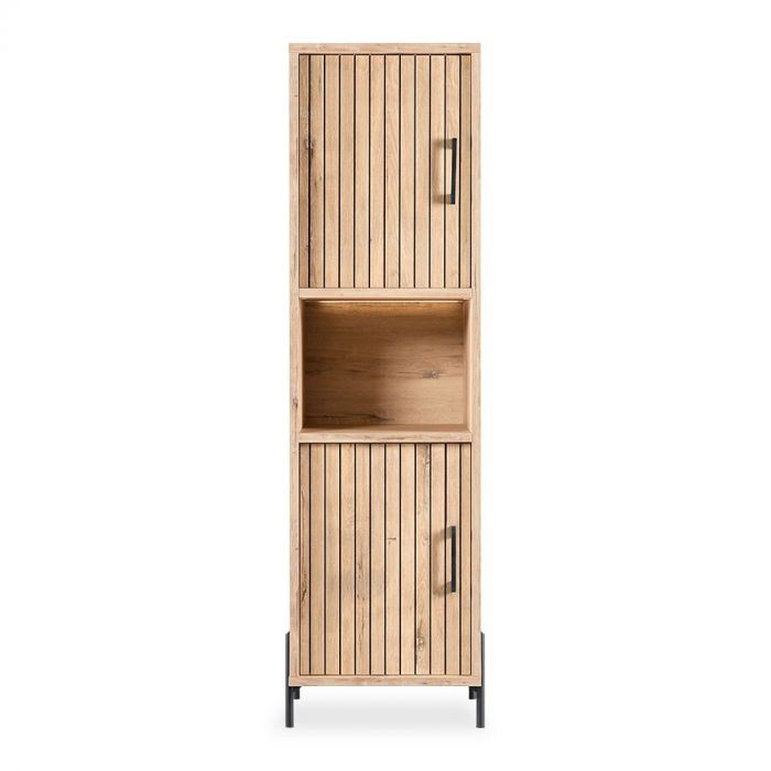 Deze kast van Profijt Meubel is afgewerkt met een melamine toplaag. Melamine heeft de uitstraling van echt hout, maar het is een kras-, slijt-, en stootvast materiaal wat erg gebruiksvriendelijk en makkelijk te onderhouden is. De Mena opbergkast heeft twee linksdraaiende deuren en een open vak. De deuren zijn voorzien van softclose, waardoor deze automatisch zachtjes dichtvallen. Achter de deuren vind je legplanken. Hierdoor biedt de kast veel opbergruimte, en is daarnaast ideaal om leuke accessoires in te zetten, die door de ingebouwde verlichting in het open vak in de spotlights worden gezet. De kast wordt ongemonteerd geleverd, maar is met behulp van een montagehandleiding eenvoudig in elkaar te zetten.