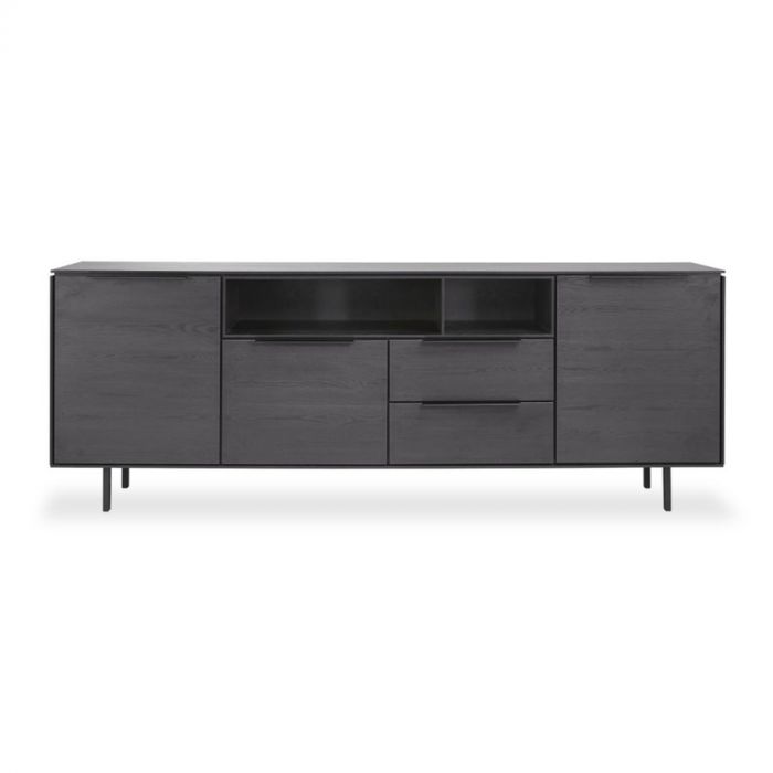 Dressoir Nero van Pronto Wonen is afgewerkt met een melamine toplaag. Melamine heeft de uitstraling van echt hout, maar is een kras-, slijt- en stootvast materiaal wat erg gebruiksvriendelijk en makkelijk te onderhouden is. Het Nero dressoir heeft drie deuren en twee laden met softclose systeem, waardoor deze automatisch zachtjes dichtvallen. Achter de drie deuren zit een legplank. Met een hoogte van 80 cm en een breedte van 220 cm, biedt het dressoir lekker veel opbergruimte. De open vakken zijn ideaal om leuke accessoires in te leggen of zetten. De open vakken kunnen (tegen meerprijs) worden voorzien van led-verlichting, voor extra sfeer.