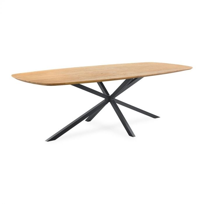 Het tafelblad, vervaardigd uit drie cm dik recycled teak, straalt karakter en warmte uit. De met zorg afgeschuinde rand voegt een subtiel vleugje verfijning toe aan deze tijdloze creatie. De tafel staat op een moderne, metalen matrixpoot die niet alleen voor stabiliteit zorgt, maar ook een eigentijdse touch aan je eetruimte geeft. De tafel heeft een Deens ovaal blad met een lengte van 260 cm en een breedte van 110 cm, waardoor je in totaal 8 stoelen aan deze tafel kwijt kunt. Omdat een Deens ovaal tafelblad geen scherpe hoeken heeft, biedt het meer ruimte voor gasten en stoelen rondom de tafel. De hoogte tot de onderkant van de tafel is circa 74 cm; dit is belangrijk als je er armstoelen aan wilt zetten. De poot van de tafel is met behulp van de handleiding eenvoudig te monteren.