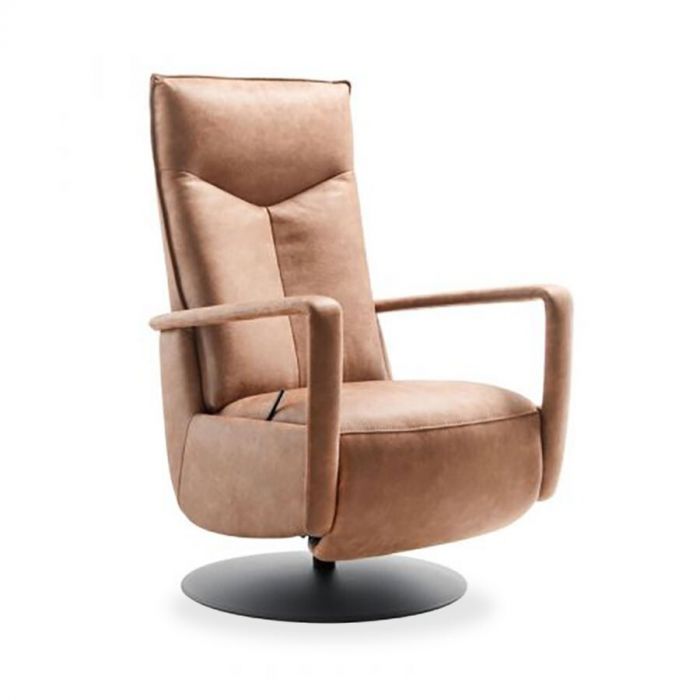 De fauteuil is manueel verstelbaar waarbij d.m.v. een hendel (en gasveer) de rug en voetensteun ingesteld kunnen worden. De hoofdsteun kan eenvoudig met de hand versteld worden. De relaxfauteuil is bekleed in bruin microleder. Microleder is een samengestelde bekleding bestaande uit een stevige onderlaag van leer en een toplaag van microvezelstof. Dit heeft een luxe, wat stoerdere uitstraling en voelt lekker zacht aan. De stoel is voorzien van een gesloten vlindernaad. In combinatie met de zwarte metalen schijfvoet geeft dit het model een moderne uitstraling.