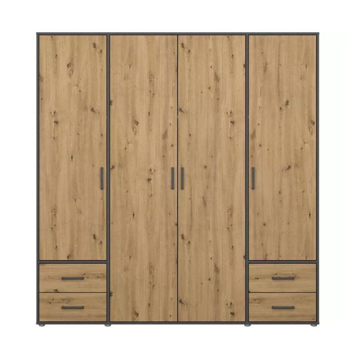 De getoonde versie beschikt over vier draaideuren en vier lades, waardoor je volop ruimte hebt voor al je kleding en accessoires. Dankzij de combinatie van een grijs metallic op de romp en eiken artisan op de deuren en lades, past de kledingkast moeiteloos bij diverse interieurstijlen. Dankzij de beschikbare kleuren Alpine wit, Grijs metalic en imitatie Eiken artisan kun je eindeloos combineren. Liever de complete kast in één kleur of juist een combi van twee opties, het is allemaal mogelijk. Voor wie minder ruimte heeft, is er ook een 140 centimeter brede versie met drie deuren beschikbaar. Beide varianten zijn te verkrijgen met of zonder lades en in verschillende kleuren. Als extra optie kun je op de lange deuren een spiegel plaatsen.