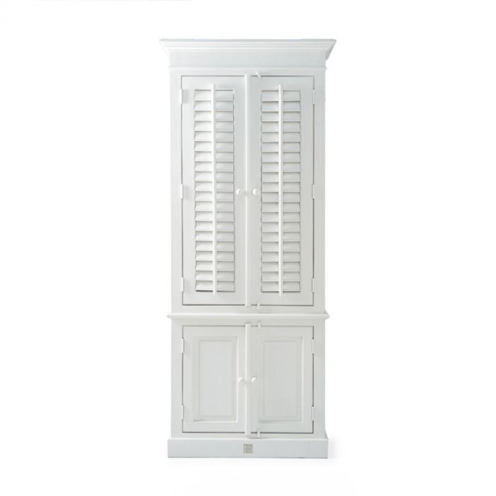 Model New Orleans heeft een romantische look door de shutters die in de deurtjes zijn verwerkt. De paneeldeuren hebben een bewerking waardoor het een brocante uitstraling heeft. Extra leuk zijn de sierlijsten aan de bovenkant van de kast, dit geeft dit model die echte Rivièra Maison zijn waar we zo gek op zijn.