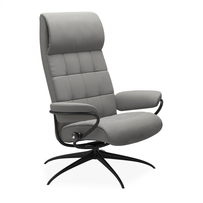 Fauteuil London is voorzien van comfort zones die jouw lichaam de juiste ondersteuning geven. Het Glide systeem is één keer in te stellen met een draaiknop en past voortaan deze zitpositie gewoon aan met je eigen lichaamsgewicht. De hoofdsteun stelt zich automatisch in terwijl u relaxt – voor ondersteuning van uw nek bij het lezen, tv-kijken en ontspannen. Je krijgt ook anatomisch correcte ondersteuning van de lendenen in elke positie. Het model is uitgevoerd met het balance adapt asysteem. Een ingetogen schommelbeweging verhoogt het comfort, alles draait om het juiste evenwicht. Met BalanceAdapt reageert de zithoek automatisch op de kleinste beweging van uw lichaam. Kortom, de juiste ingrediënten voor perfectie in persoonlijk zitcomfort. De getoonde uitvoering is bekleed met prachtig Paloma leer in de kleur Silver Grey. Het onderstel, de Star Mat Black, is één van de vier keuzemogelijkheden. Deze versie met hoge rug is tevens verkrijgbaar met een lage rug. Om je eigen persoonlijke fauteuil te creëeren is er een stoffen-en leercollectie beschikbaar. Voor het laatste stukje relaxplezier is er een bijpassende hocker leverbaar.