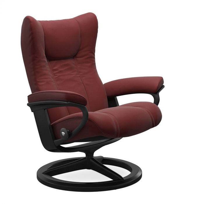 Het Signature onderstel is modern en strak, en combineert houten details met gepolijst of mat zwart aluminium. Het afgeronde profiel van de armleuningen en de voet vormen een elegante eenheid. Het Signature onderstel is 360° draaibaar en heeft het handige BalanceAdapt systeem. Een ingetogen schommelbeweging verhoogt het comfort, alles draait om het juiste evenwicht. Met BalanceAdapt reageert de zithoek automatisch op de kleinste beweging van uw lichaam. Bij het Plus-system stelt de hoofdsteun zich automatisch in terwijl je relaxt. Het zorgt voor ondersteuning van je nek bij het lezen, tv-kijken en ontspannen. Je krijgt ook anatomisch correcte ondersteuning van de lendenen in elke positie. Met het Glide-system stel je de draaiknop één keer in waardoor deze zich voortaan aanpast aan jouw zitpositie met je eigen lichaamsgewicht. De getoonde Small uitvoering is bekleed in leder Paloma in de warme kleur Cherry. Het Signature onderstel is zwart gebeitst en één van de drie verkrijgbare types. Naast de Small versie zijn er tevens een Small en Large uitvoering leverbaar. Om je eigen fauteuil te personalisen is er ruime keuze uit een mooie stoffen-en ledercollectie.