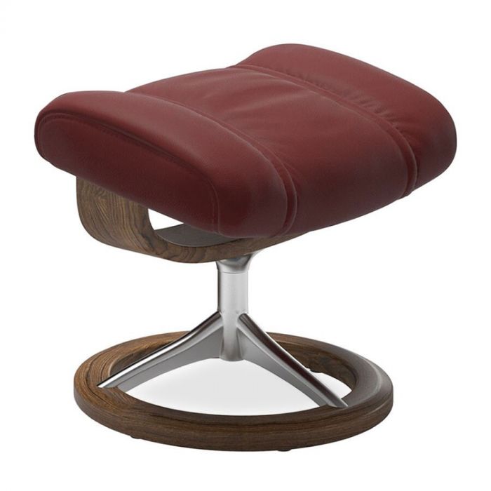 De getoonde uitvoering is gestoffeerd in leder Paloma in de kleur Cherry. Het Signature onderstel van hout Teak /Chroom is één van de drie verkrijgbare keuzes. Hocker Wing is verkrijgbaar in de materiaalsoorten stof en leder in diverse kleuren.