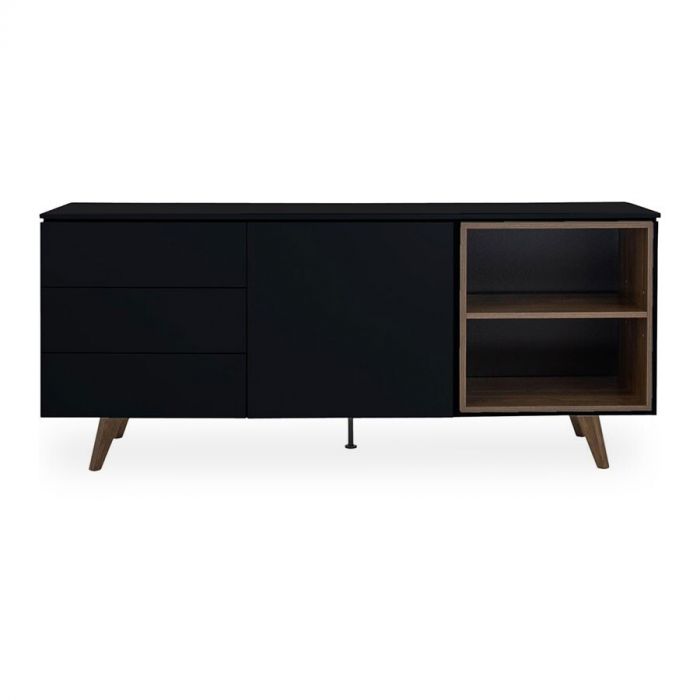 Dit dressoir is een ware blikvanger met zijn slanke profiel en minimalistische uitstraling. Een enkele deur en drie royale laden bieden voldoende opbergruimte. De twee open vakken zijn verfraaid met walnootfineer, de perfecte showcase voor jouw dierbare collecties of decoratieve stukken. De schuin geplaatste houten poten voegen een vleugje retro-charme toe. Of het nu in de woonkamer, eetkamer of hal staat, het Plain dressoir zal ongetwijfeld een sfeervol middelpunt worden. Dit model is onderdeel van een serie waar tevens een bergkast en tv-meubel in thuis horen. Naast deze zwart / walnoot uitvoering zijn er de kleurvarianten wit / walnoot, forest / walnoot en compleet zwart, wit of forest.