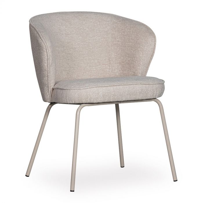 Het onderstel van Admit is vervaardigd van pebble-kleurig metaal, wat de eetkamerstoel een warme uitstraling geeft. Het zitgedeelte is gestoffeerd met onze zachte Holy geweven stof in de kleur Pebble, die direct een warme sfeer in huis brengt. Met een Martindale score van 100.000 is de Holy geweven stof geschikt voor intensief gebruik. De dichte weeftechniek garandeert de sterkte van de stof, waardoor slijtage of scheuren minimaal zijn. Liever een andere kleur of uitstraling? Maak dan een keuze uit de varianten Bouclé Beige, Naturel of Nougat en Fluweel Zwart en Khaki.